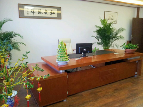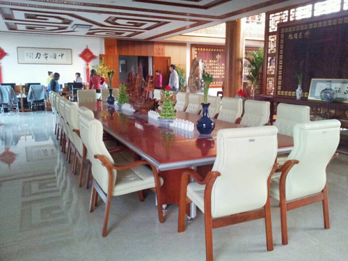 采用思進家具櫻桃色會議臺H6060Y,與天花板顏色相搭配,盡顯大氣端莊